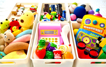 子どものおもちゃ箱は蓋付きではなくバスケットタイプのものにする、戸棚や引き出しの中に箱や缶を収納せず使ったものをそのまま入れられるようにするなどの工夫をすると、使ったものを元に戻しやすい環境づくりが可能ですよ。