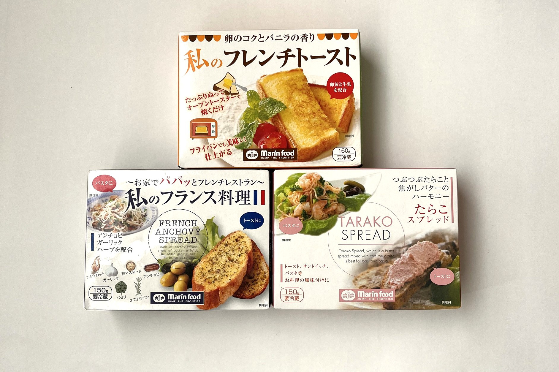 そして、これまで〇〇たらことか、タラコ〇〇などで食べた中で一番美味しい!と思ったのが『たらこスプレッド』(429円)。「塗って焼いたら〜」シリーズの明太子のより、魚卵含有率見た目高め。濃いめのピンク色です。これが塩気強めでめちゃくちゃ美味しい! 箱には「トースト、サンドイッチ、パスタ等」と書かれているのに思わず納得。明太子じゃなくてタラコだから辛味もなく万能に使えます。