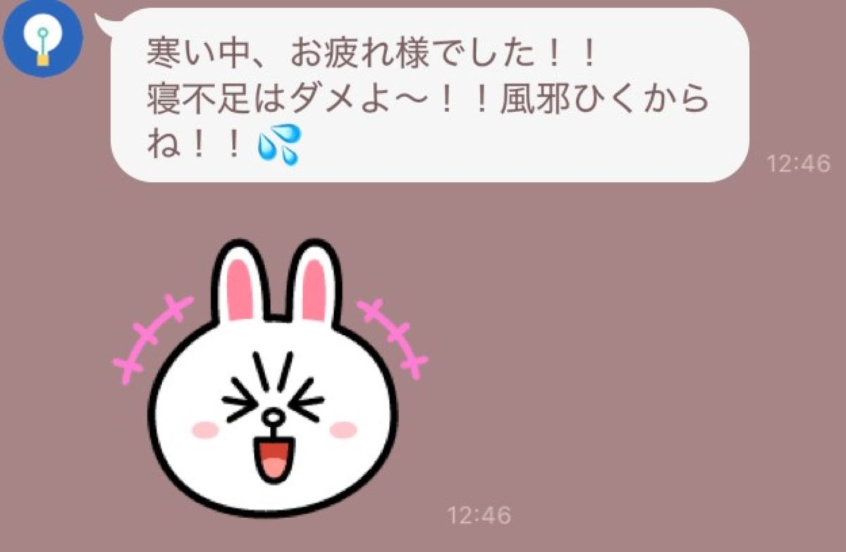 ★NG例:「寒い中、お疲れ様でした!!寝不足はダメよ〜!!風邪ひくからね!!」