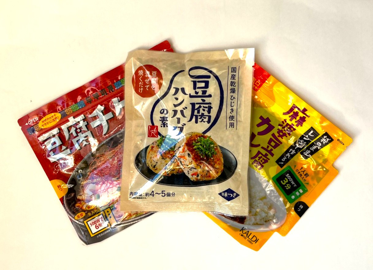 それなら高タンパク低カロリーのヘルシーフード「豆腐」のおかずなら、お腹いっぱいになっても背徳感低いのでは!? ということで、『カルディ』で「豆腐系〇〇の素」3つを買ってみました。