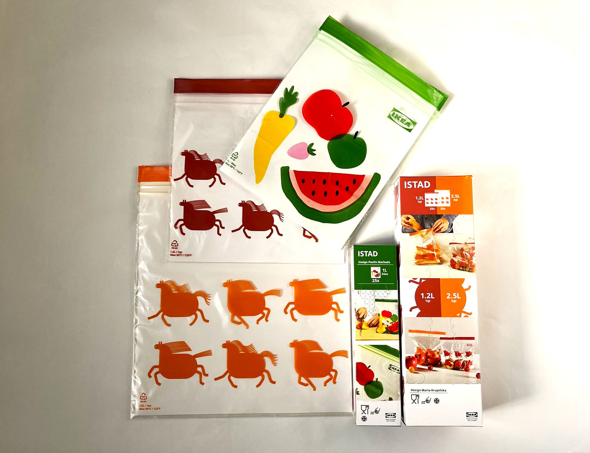 「ISTAD(イースタード)フリーザーバッグ」(329円)は、2.5Lと1.2L各25枚、計50枚のセット。冷凍庫対応可、50℃までの食品を入れられます。もちろん、口の部分は2重になっているので限りなく密封に近い状態で保存が可能です。大きい方はオレンジ、小さい方は赤いぽっちゃり馬で、よーく見ると1頭1頭のたてがみや尾っぽ、足の動きが違う。パラパラ漫画にしたら楽しそうなデザインです。