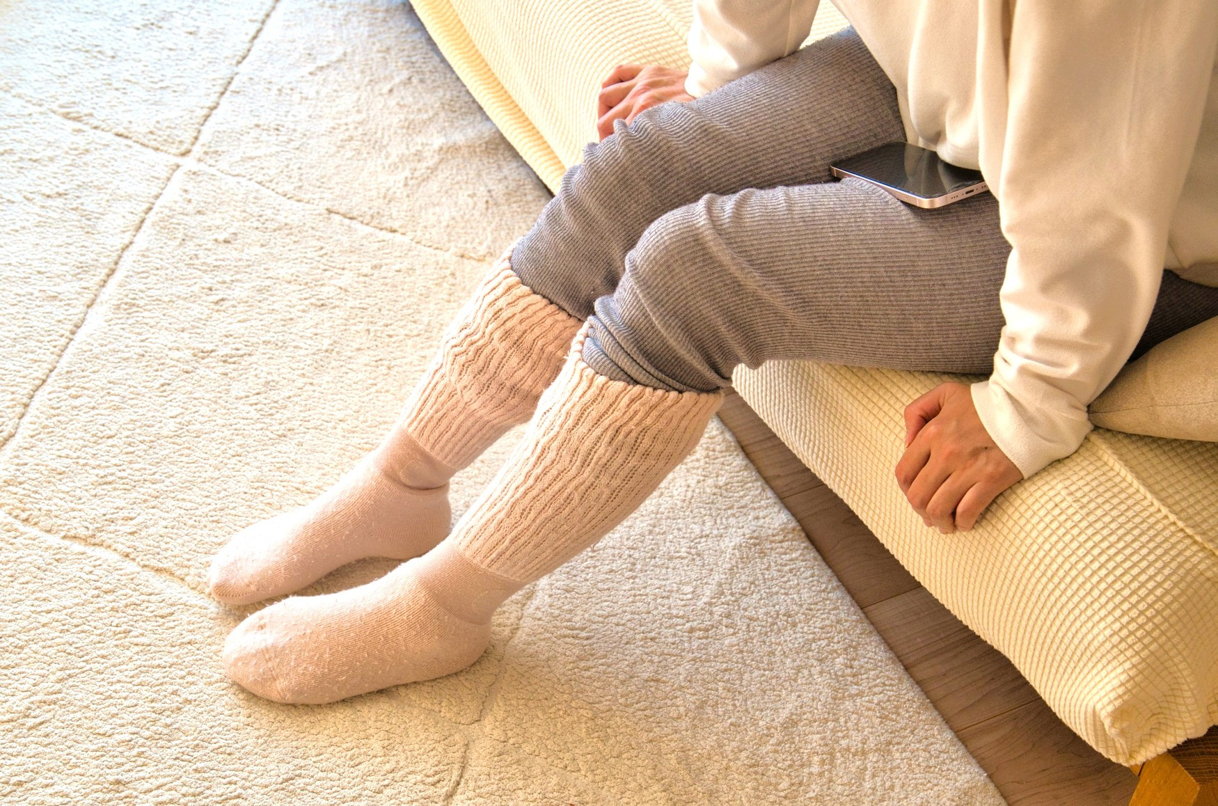 履いているだけで気持ちよくて温かい。足裏に滑り止めがついているので、フローリングでもツルッとなりにくい設計です。とくに、キッチンに立つ人は足もとが冷えがちなので、足元から温まるこのソックスなら快適にお料理ができますよ。