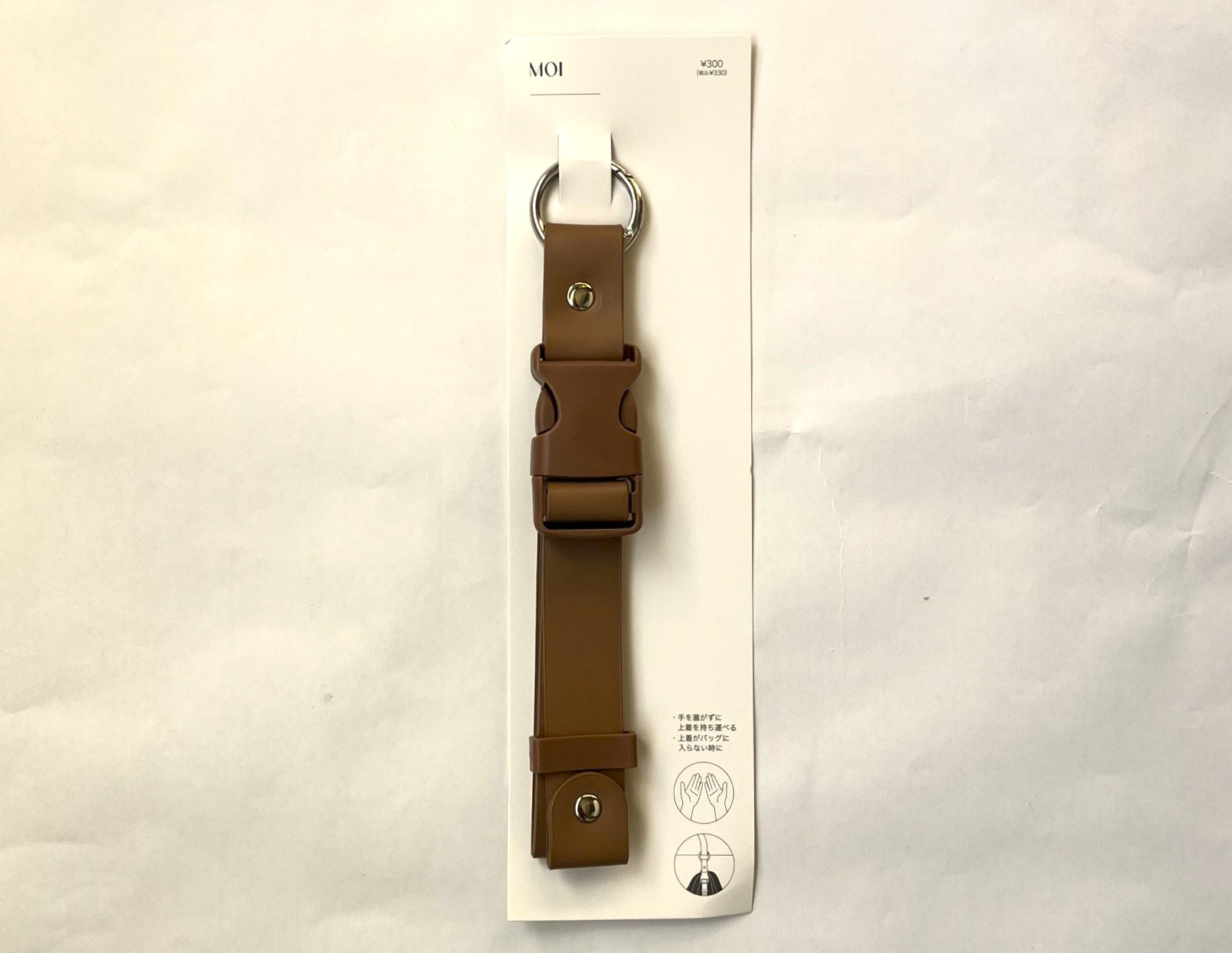 そんなときに便利なものを『3COINES』で発見。それが「ジャケットホルダー」(330円)。カバンについているフックにこれを繋いで輪っかを作り、その間にジャケットなどを通せば「上着を手に持ち歩かなくてオッケー!」というものです。