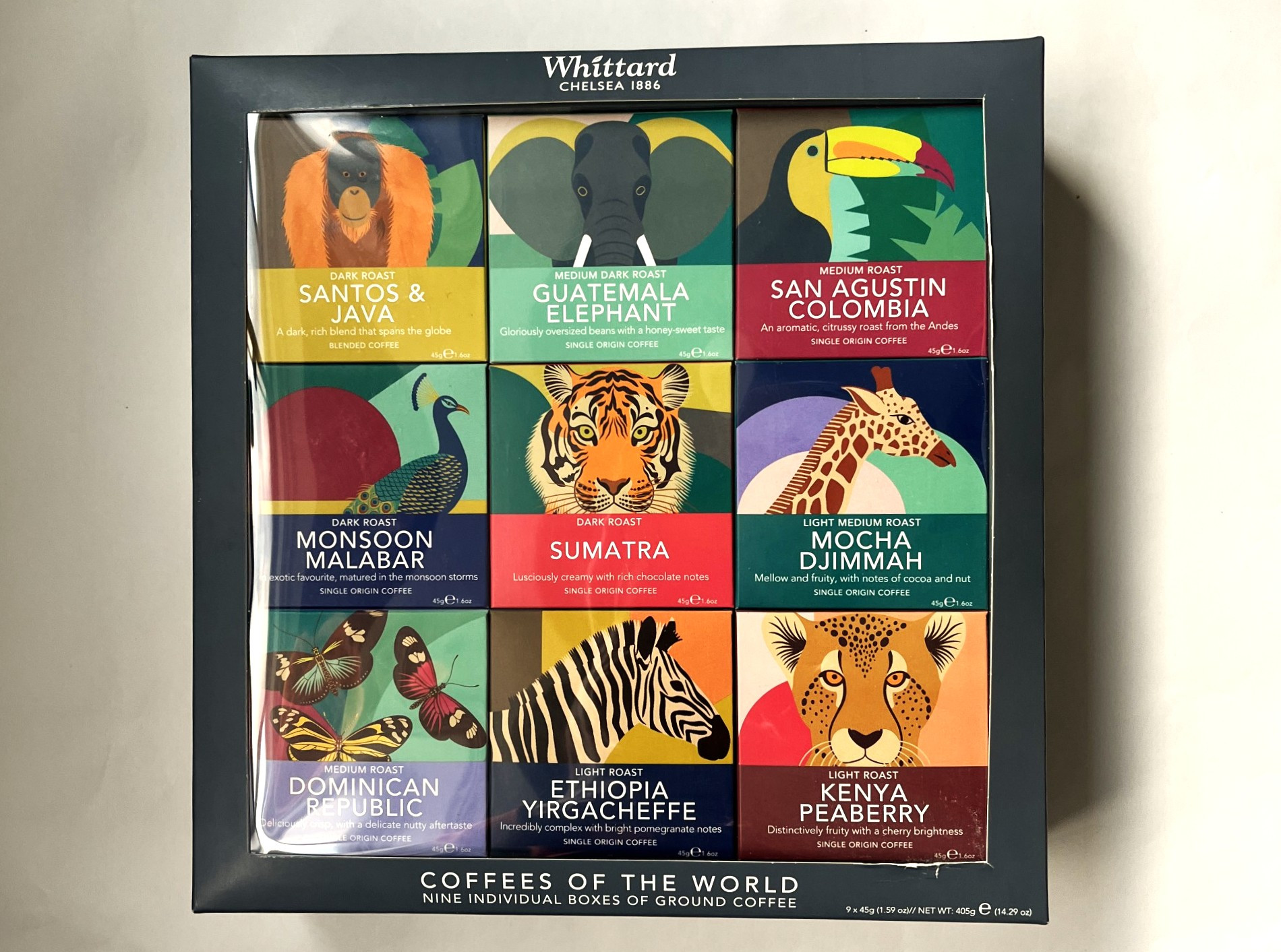 パッケージデザインのインパクトに思わず手に取ってしまった「ウィッタード コーヒーオブザワールド」(4,398円)。トラやキリン、シマウマやゾウなどが描かれた正方形の箱が9箱1セットになっています。ウィッタードの公式サイトでも販売しているのですが、お値段8,400円+送料20£。でも、『コストコ』なら送料まで入れても半値以下で販売。ありがとう!