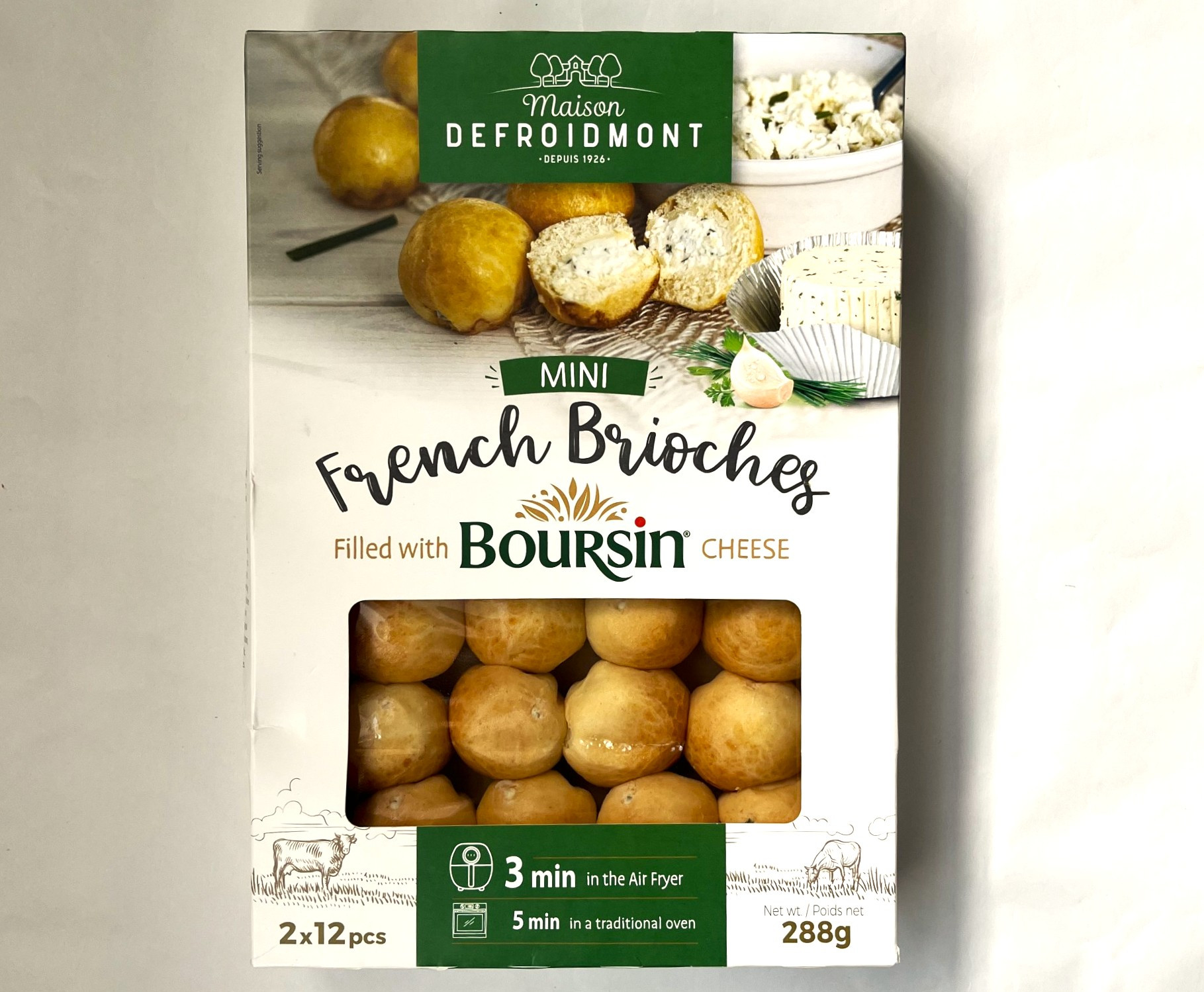 箱を開けてみると小さくて丸い12個入りパックが2つ。開封後、一気に食べなくていいのはありがたい。食べ方はフライヤーで3分加熱、またはオーブンで5分。日本語の説明では「オーブンを180度に予熱してアルミホイルを被せて5~7分温めます」と書かれています。